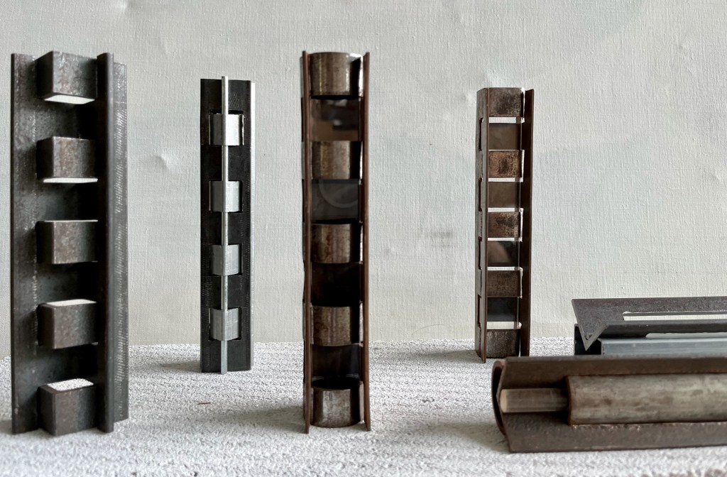 Zonder titel, 2022. Diverse technieken op papier 210 x 100 cmStudies in metaal 2015-2018, 18 cm hoogStudies in metaal 2015-2018, 18 cm hoog